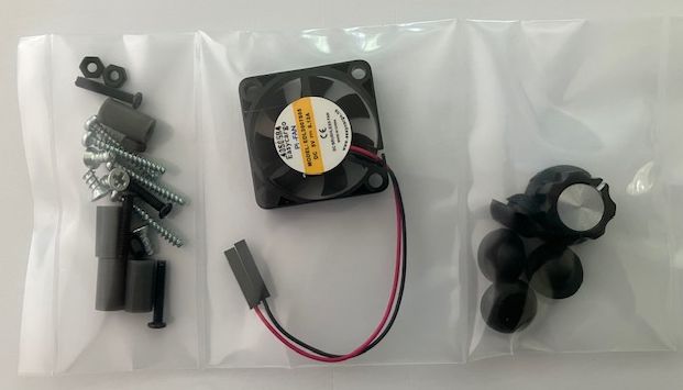 Four each: .72” board screws, .25” lid screws, plastic spacers, rubber feet, fan screws & fan nuts.
